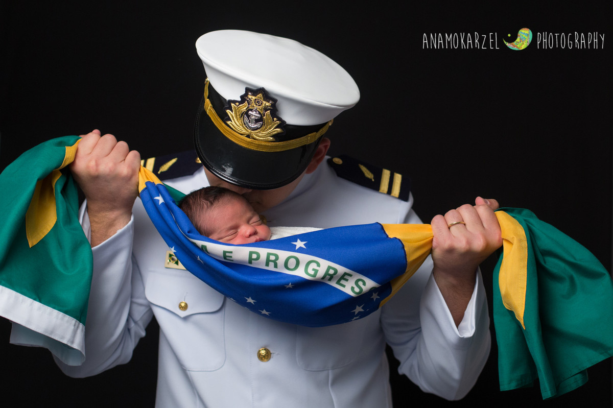 Quando eles vieram pra o nosso encontro inicial, me falaram de uma foto que queriam fazer, com o filho embalado na bandeira do Brasil. Os dois são das forças armadas, Carol, da Aeronáutica e Elton, da Marinha. Nossa!!! Esta foto, fazia todo o sentido pra eles. Achei a idéia maravilhosa, desde o início. Só não contava que mexeria tanto comigo, na hora de fazê-la, me arrepiei. A emoção contida tomou conta de mim, ao colocar o Bento sob a força e cuidados do pai; sob o amor e afeto, no colo da mãe. Foi lindo demais este momento, incrível e inesquecível!!!