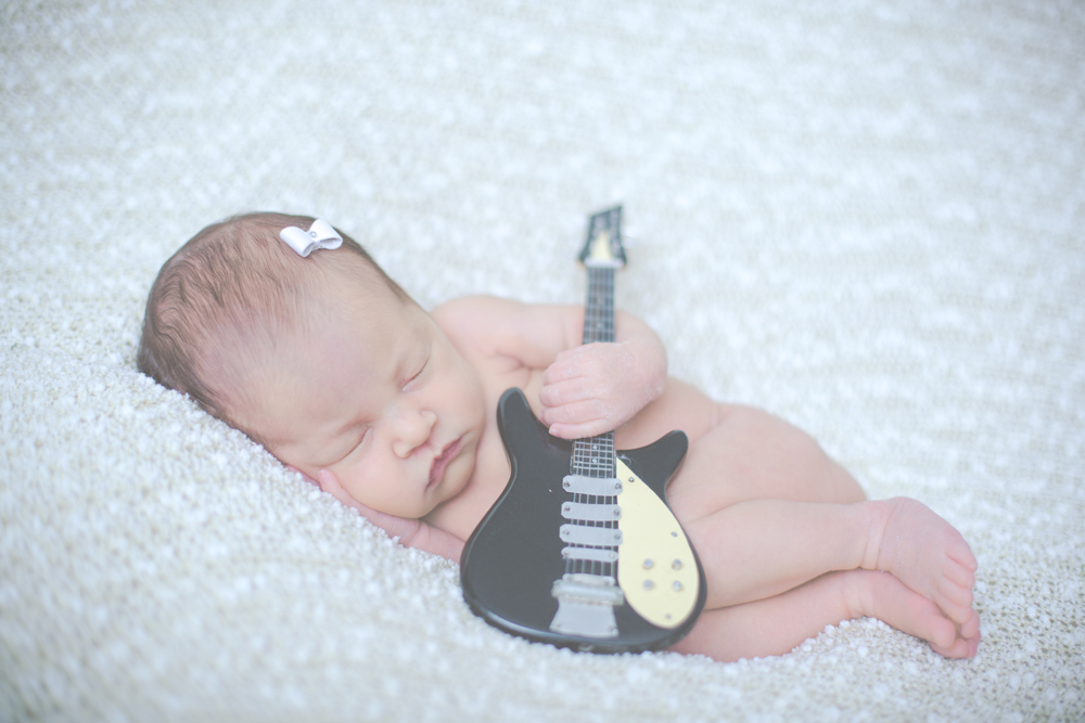 Os pais tem algumas paixões, além da família, uma delas é a cachorrinha Luna, a outra é o violão. Então como deixa-los de fora do ensaio newborn da pequena Mariana, o maior presente da vida deles?